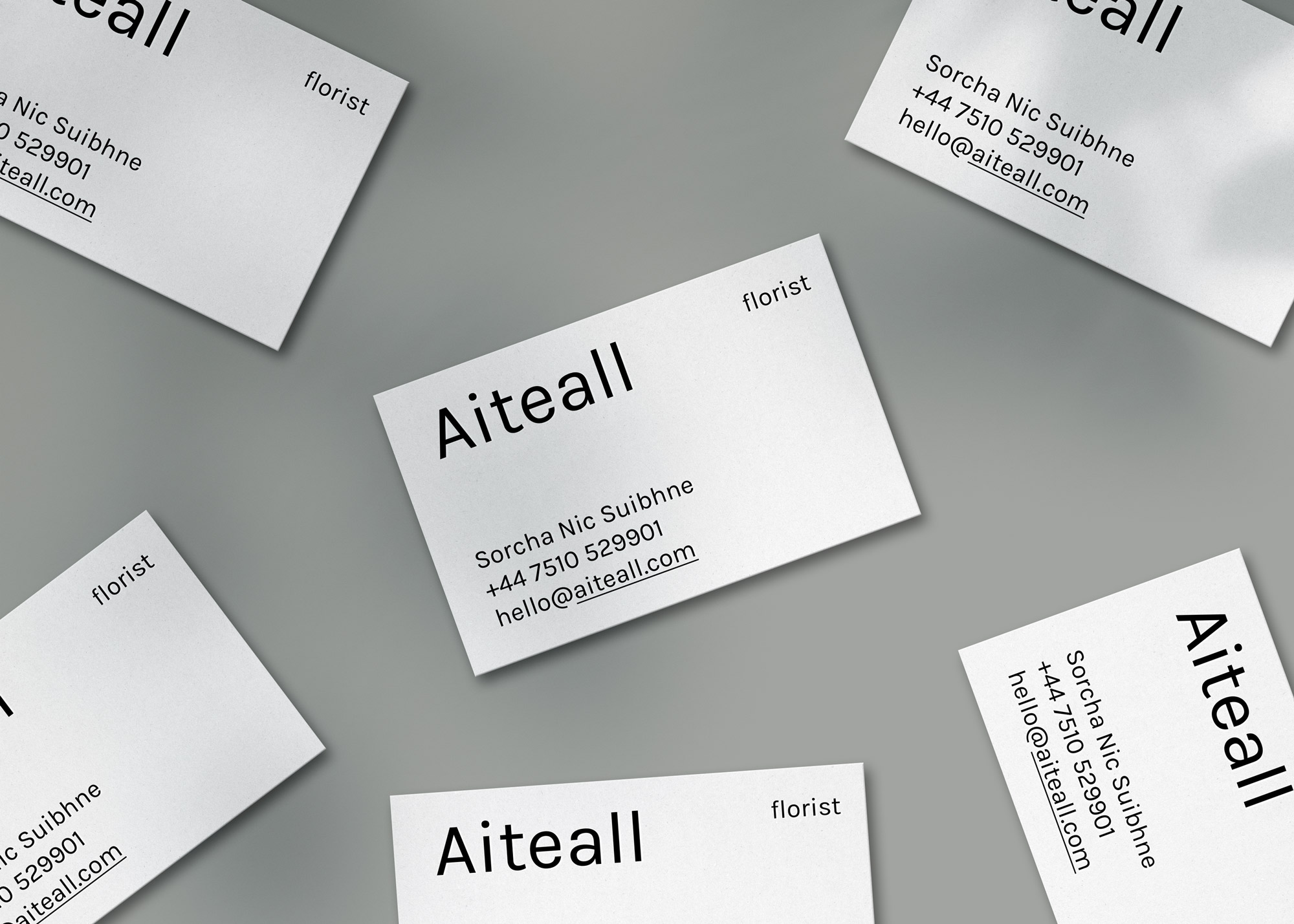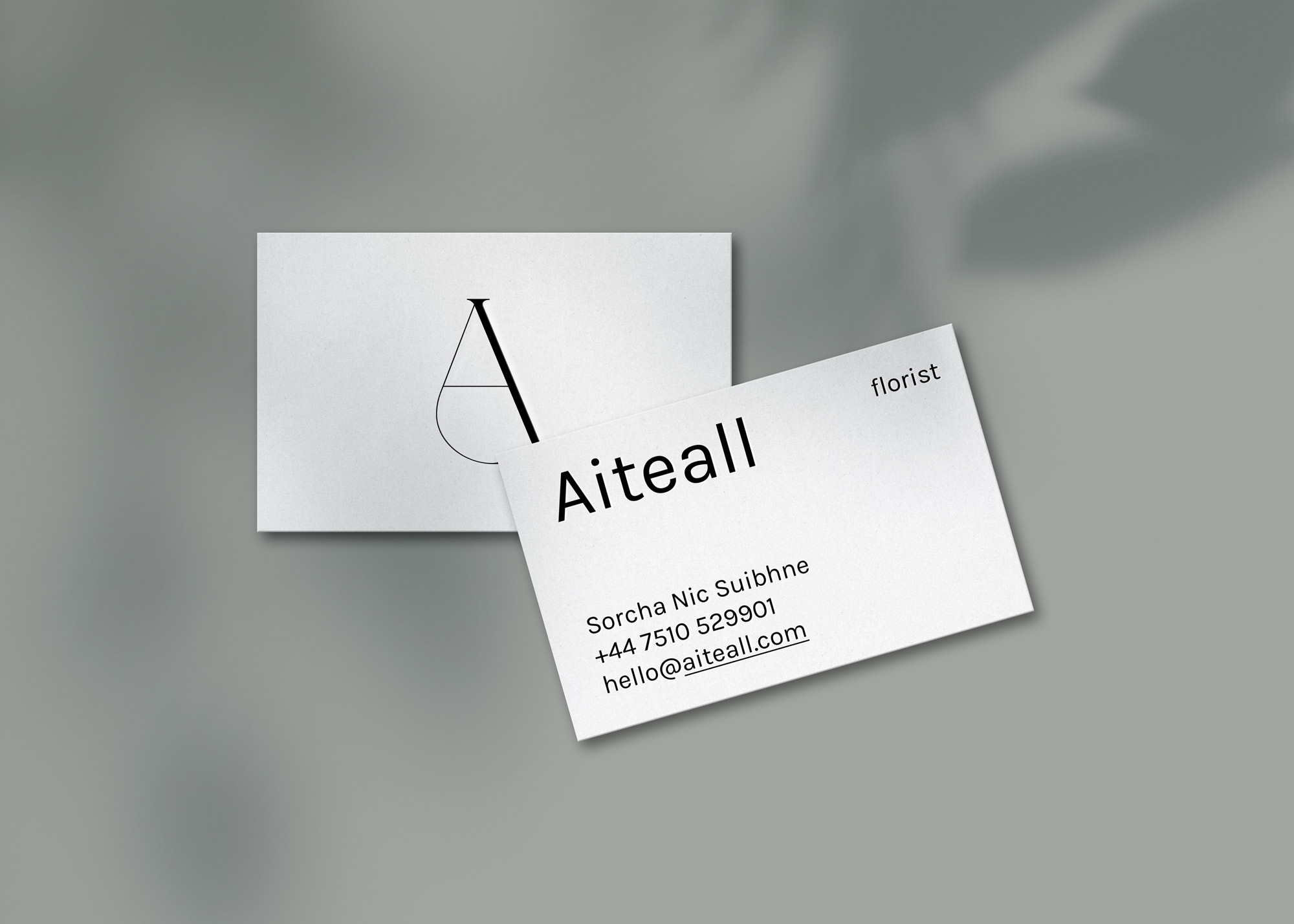 Aiteall is an Irish word – a spell of sunny weather between showers of rain. Aiteall takes inspiration from the changing seasons and changing surroundings creating natural, unstructured floral arrangements and displays for any occasion or setting. Inspired by this conception, to reflect the delicacy and gracefulness of the florist's arrangements a typography identity was created utilising foil details and pattern to symbolise the brief rays of sunshine of the Irish spring.